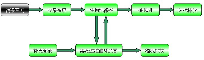 管道收集裝置將惡臭氣體送入Green-XD生物洗滌器,洗滌液由霧化噴灑裝置噴灑到生物填料表面,氣流與洗滌液在穿過生物填料層的過程中完成生物的氣液擴散、液固擴散、生物氧化三個過程,生物填料表面生物膜中的微生物以惡臭氣體物質(zhì)為營養(yǎng),惡臭物及VOC被微生物氧化分解,在轉(zhuǎn)化過程中產(chǎn)生能量,微微生物的生長與繁殖提供能源,使惡臭氣體物質(zhì)的轉(zhuǎn)化持續(xù)進行,經(jīng)凈化后的氣體由抽風機引出排放。