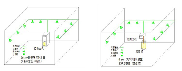 Green-EP高壓霧化噴灑除臭設(shè)備有壁掛式和柜式兩種形式。壁掛式設(shè)備可以固定在墻壁上,不占地面空間;柜式設(shè)備配有移動(dòng)萬(wàn)向輪,可方便地置于室內(nèi)任何地方,占地面積不到0.5㎡。