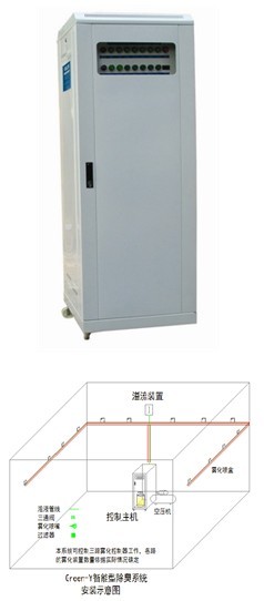 控制系統(tǒng)、微生物除臭劑和植物提取液配置和供應系統(tǒng)集合的獨立的機柜內(nèi),可移動到室內(nèi)適當?shù)牡胤健lF化噴嘴系統(tǒng)則根據(jù)實際需要,布置在室內(nèi)壁四周和固體污物堆積的地方。